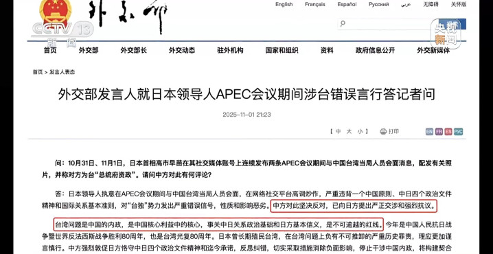 事实上,上任不到一个月,高市早苗就已经多次触及中国的红线。10月底的一场国际会议,她公然与中国台湾当局人员会面,并在社交媒体发布消息和照片。中方对此坚决反对,已向日方提出严正交涉和强烈抗议,并向日方表明,台湾问题是中国核心利益中的核心,事关中日关系政治基础和日方基本信义,是不可逾越的红线。